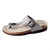 Flip-flop i naturmaterial med tåavskiljare i plast. Vid val av storlek, skall man beakta att ingen del av foten ska komma upp på kanten av fotbädden, ta i så fall en större storlek. Fotbädden är tillverkad av äkta naturkork och naturlatex, och belagd med ett tunt lager starkt mjukt oxläder. Sulan, som är anatomiskt utformad, är ca: 12 mm högre vid hälen än vid tån, vilket motsvarar en normal promenadsko. Tack vare skons inbyggda hälkudde, kan man stå och gå länge på hårda golv utan att bli trött. Fotbädden är även uppbyggd under tålederna för att ge ett bra grepp. Ovanlädret är  fritt från PCP, AZO-färgämnen och andra farliga garvnings- och beredningsämnen.
