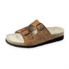 Herrpantoletti naturmaterial med två remmar. Vid val av storlek, skall man beakta att ingen del av foten ska komma upp på kanten av fotbädden, ta i så fall en större storlek. Fotbädden är tillverkad av äkta naturkork och naturlatex, och belagd med ett tunt lager starkt mjukt oxläder. Sulan, som är anatomiskt utformad, är ca: 12 mm högre vid hälen än vid tån, vilket motsvarar en normal promenadsko. Tack vare skons inbyggda hälkudde, kan man stå och gå länge på hårda golv utan att bli trött. Fotbädden är även uppbyggd under tålederna för att ge ett bra grepp. Ovanlädret är fritt från PCP, AZO-färgämnen och andra farliga garvnings- och beredningsämnen.