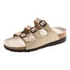 Pantolett i naturmaterial med tre remmar. Vid val av storlek, skall man beakta att ingen del av foten ska komma upp på kanten av fotbädden, ta i så fall en större storlek. Fotbädden är tillverkad av äkta naturkork och naturlatex, och belagd med ett tunt lager starkt mjukt oxläder. Sulan, som är anatomiskt utformad, är ca: 12 mm högre vid hälen än vid tån, vilket motsvarar en normal promenadsko. Tack vare skons inbyggda hälkudde, kan man stå och gå länge på hårda golv utan att bli trött. Fotbädden är även uppbyggd under tålederna för att ge ett bra grepp. Ovanlädret är  fritt från PCP, AZO-färgämnen och andra farliga garvnings- och beredningsämnen.