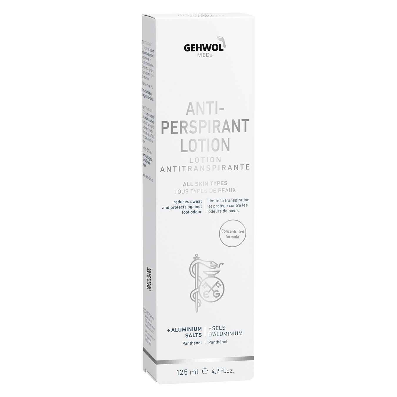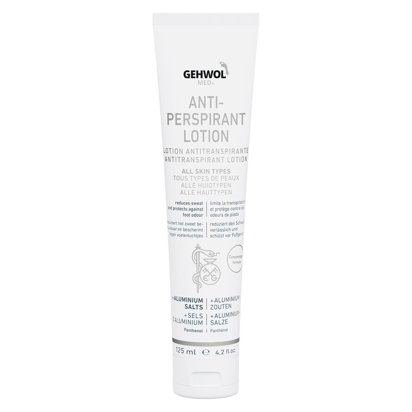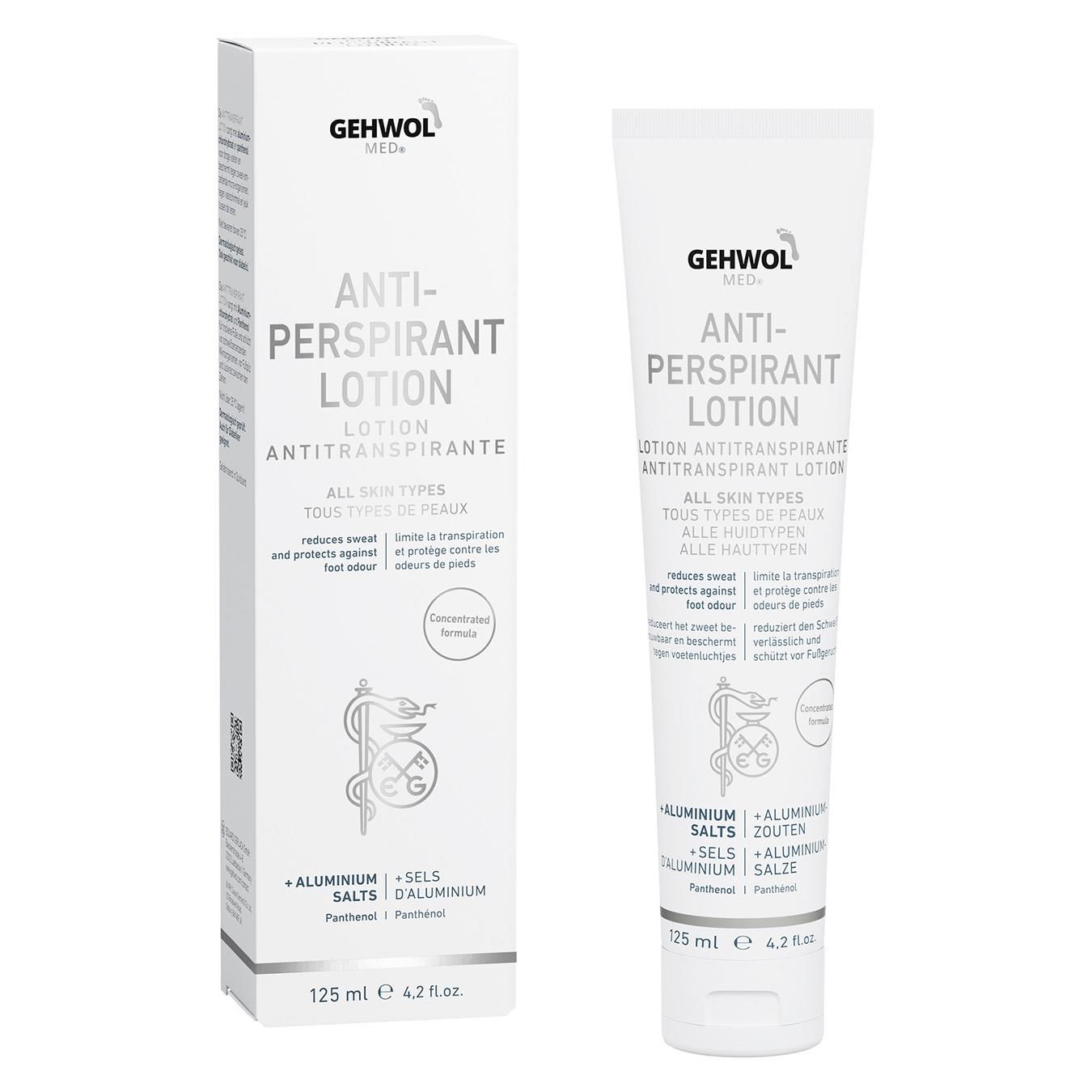 Gehwol med® Antitranspirant är en kräm som vid regelbunden användning leder till torrare och luktfria fötter. Foten skyddas mot svettnedbrytande mikroorganismer, fotsvamp och klåda mellan tårna. Svettbildningen minskas och doftbildningen förhindras. Samtidigt motverkas sprödhet och en stark uttorkning av huden. GEHWOL med® Antitranspirant Cremelotion reducerar svett och skyddar mot fotsvettslukt. Aloe Vera, avocadoolja och glycerin vårdar huden. Aluminiumchlorohydrat reducerar svettbildningen. Zinkricinoleat tar bort lukt och Natrium-PCA skyddar huden mot uttorkning.