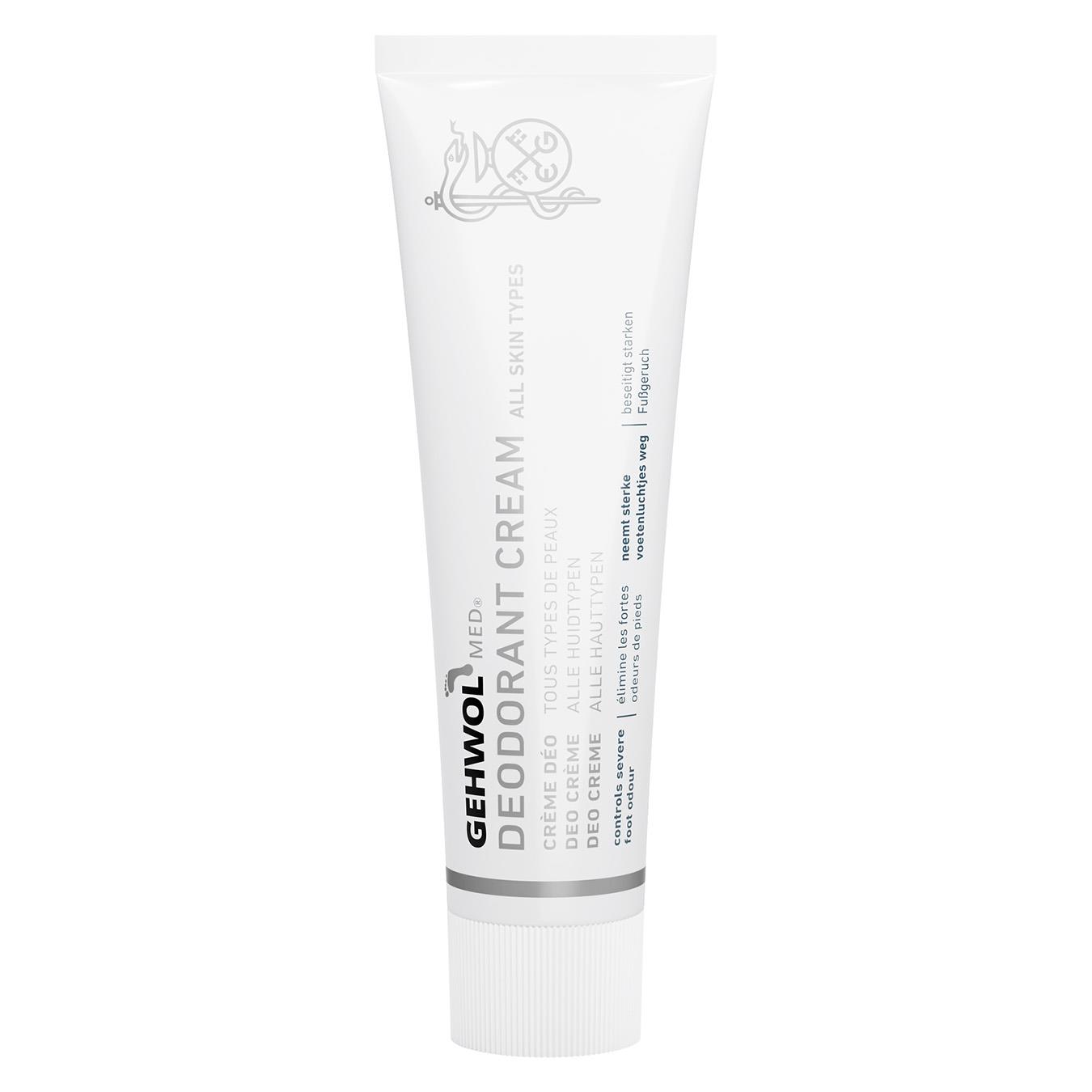 Gehwol med® Fussdeo-creme med angenäm doft som har en bas av jojobaolja och aloe vera. Denna kombineras med den höga koncentrationen av extrakt från Manuka-oljan med mikroniserad zinkoxid för att skydda foten mot stark fotlukt i minst 24 timmar. Tack vare att Manuka-oljans alla välkända substanser verkar mot svamp och bakterier, passar den utmärkt för fothygien. Zinkoxid i sin mikroniserade form är för vården av den ömtåliga huden en utmärkt substans med dess antimikrobiella och hudskyddande egenskaper. Aloe vera verkar bakteriostatiskt, inflammationshämmande, regenererande och fuktgivande. Jojobaolja tas lätt upp av huden. Den innehåller värdefulla, fleromättade fettsyror och stöder de naturliga hudfunktionerna. Vid regelbunden användning av denna mildfettande creme blir foten luktfri, huden blir fräsch och man får dessutom ett skydd mot fotsvamp.